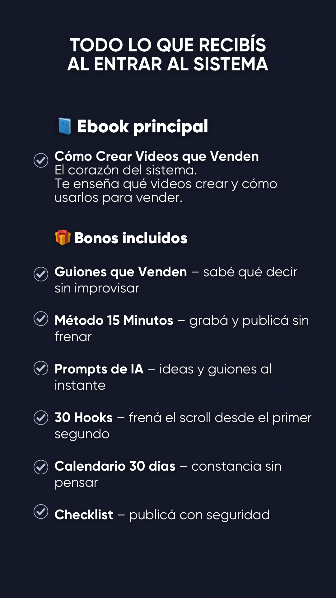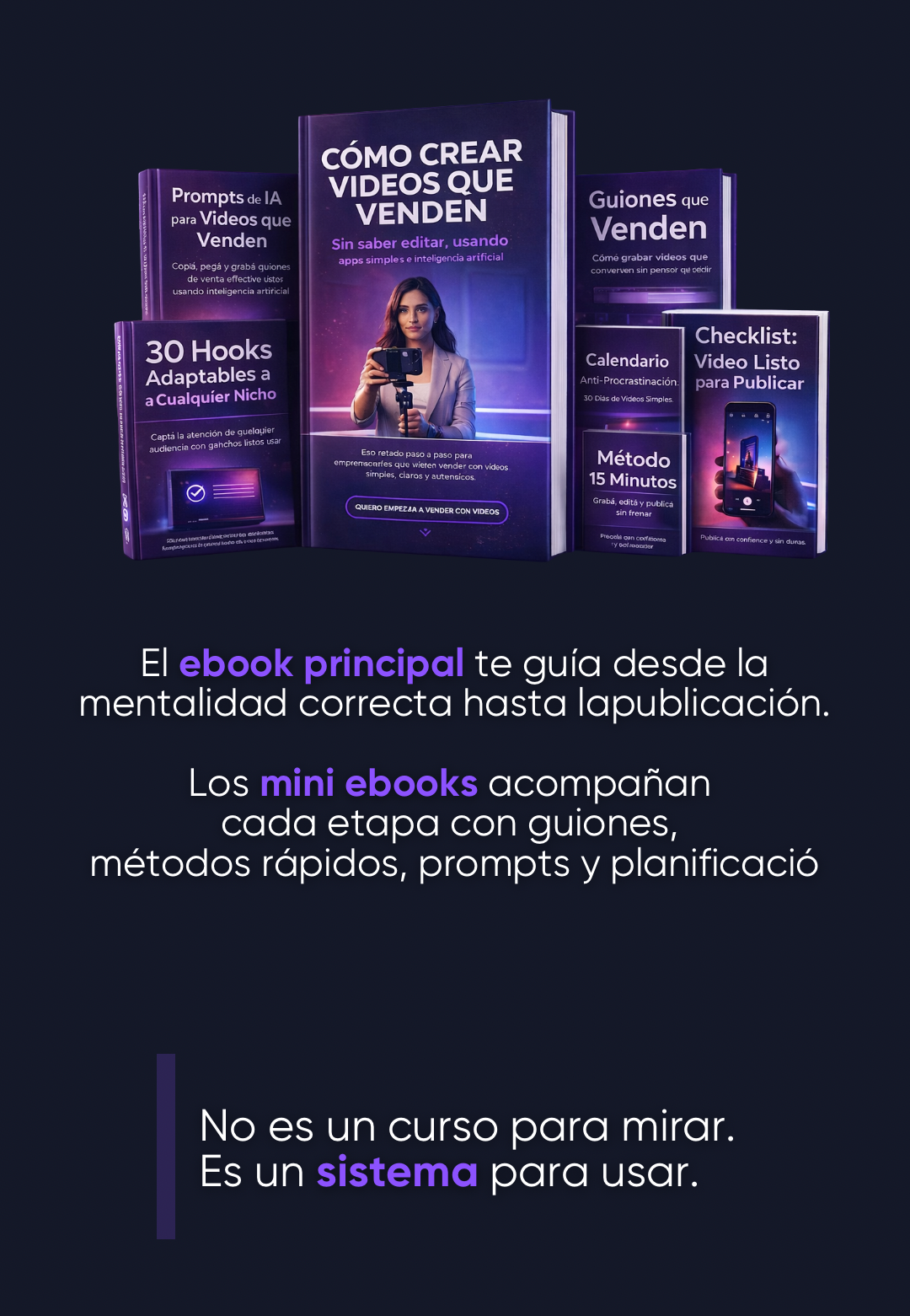 Accedé al sistema Cómo Crear Videos que Venden, descargá el ebook principal y los mini ebooks, leelos con calma y empezá a aplicar el método a tu ritmo.